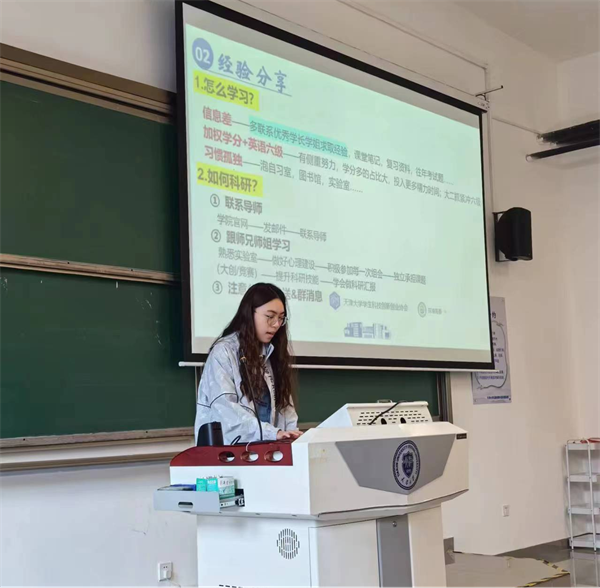 随后赵玟超同学从学习成绩、科创竞赛、社会实践、志愿服务等方面为同学们介绍了环境工程专业的学习经历,并且从大一开始如何规划学习、联系导师开展科技创新训练等做了详细的经验分享,作为榜样为同学们成长为具有家国情怀、创新精神、国际视野的卓越工程师指明了方向。