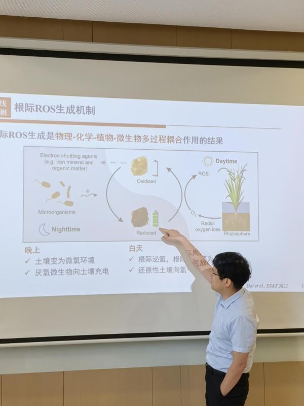 浙江大学环境与资源学院褚池恒研究员在我院进行了题为“活性氧时空分辨检测与环境界面过程”的学术汇报。褚研究员以活性氧(ROS)为切入点,研发的成像检测、在线检测和野外监测系统为界面过程的研究、界面机制的研究以及界面调控提供了基础。并且发现水稻根际是土壤物质和能量交换的热区,电子在根际可以远距离传递并生成活性氧,这一发现改变了 ROS 生成需要氧气和电子源直接接触的传统认知。他们还开发了界面电子传递热成像方法,并利用该方法现场验证了潮间带水-土氧动态界面 ROS 生成热区的存在。褚研究员的研究成果为理解土壤界面 ROS 过程提供了新的视角,并为调控土壤污染物转化归趋提供了理论依据和技术支持。相信随着该领域研究的不断深入,将有助于我们更好地保护土壤环境和人类健康。