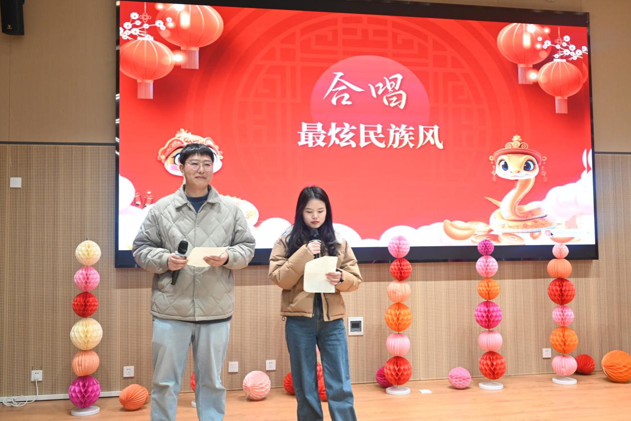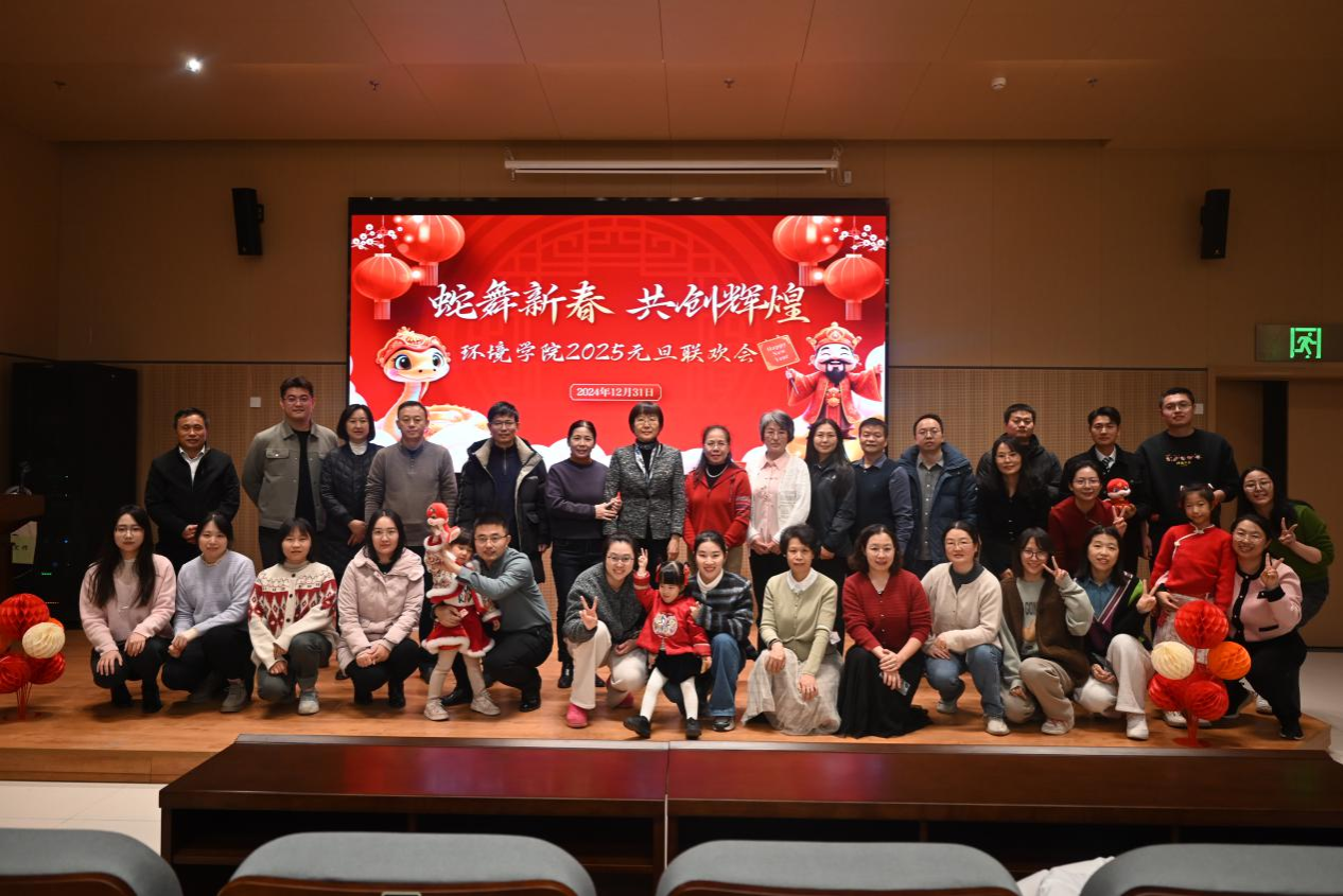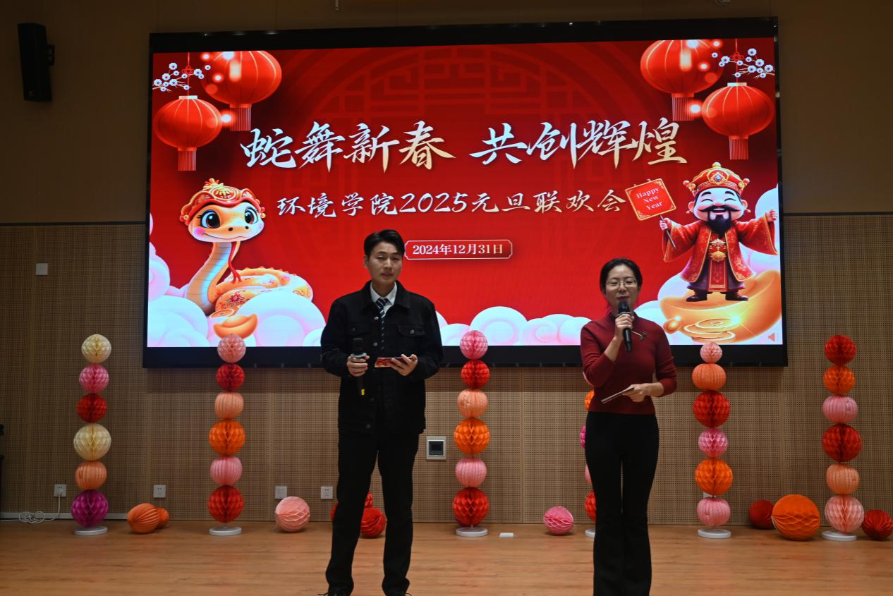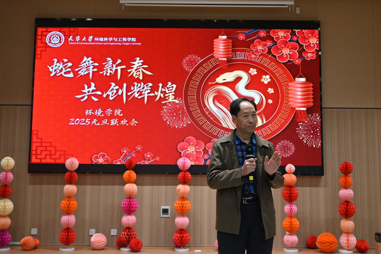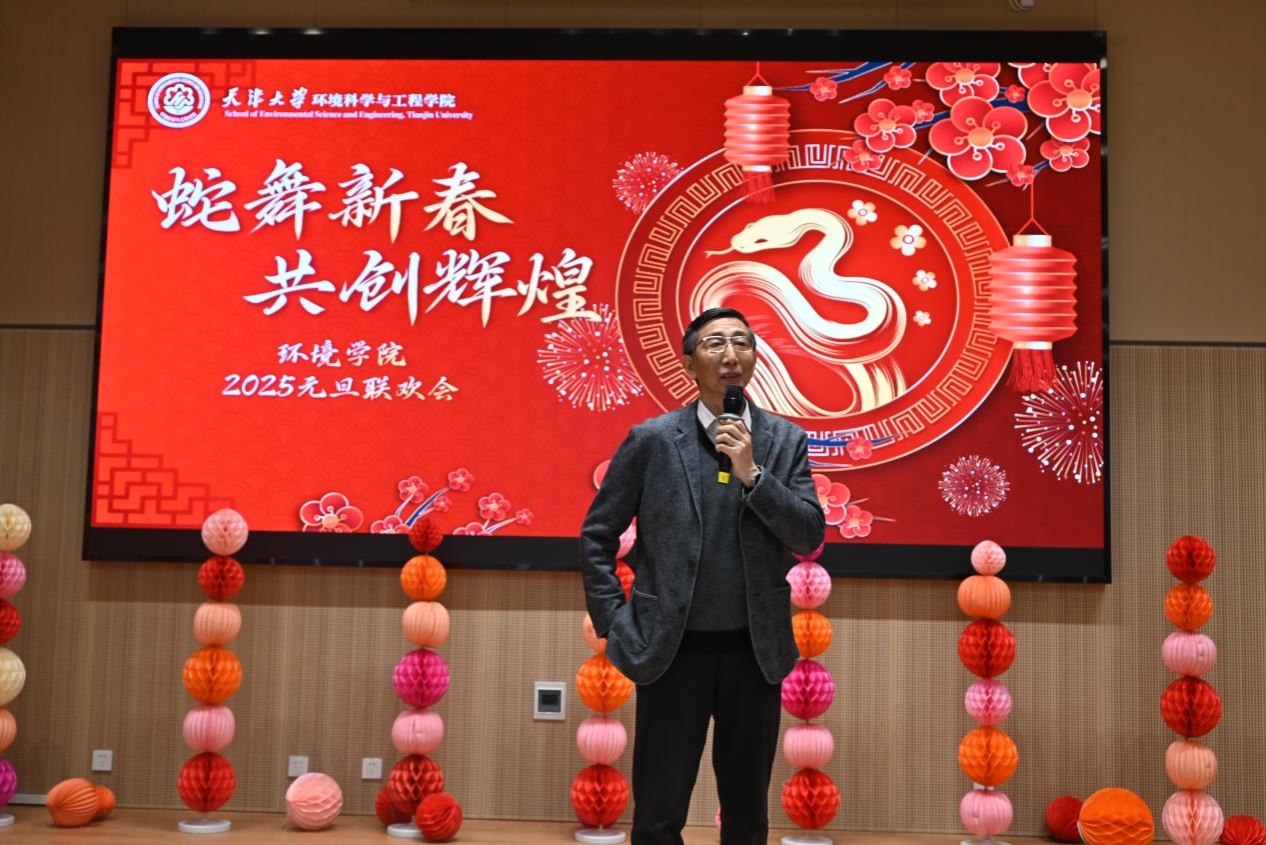 2024年12月31日下午,环境学院在59楼报告厅举办了“蛇舞新春 共创辉煌”新春联欢会。联欢会邀请到原天津工业大学党委书记张宏伟、原环境学院党委书记徐友浩、原环境学院院长张书廷、天津大学党委巡视办主任刘洪波、天津大学建筑工程学院党委书记马德刚、天津大学生命科学学院党委书记牛志广、天津大学研究生院学位办主任刘庆岭、天津大学资产处副处长韩冰霜等曾在环境学院工作过的领导老师参加了活动,院长展思辉、学院党委书记杜云飞、副书记张灿,副院长杨冬、吕石磊、宋春风、程占军出席,与全院70余位教职工共迎新年,副院长杨冬主持会议。