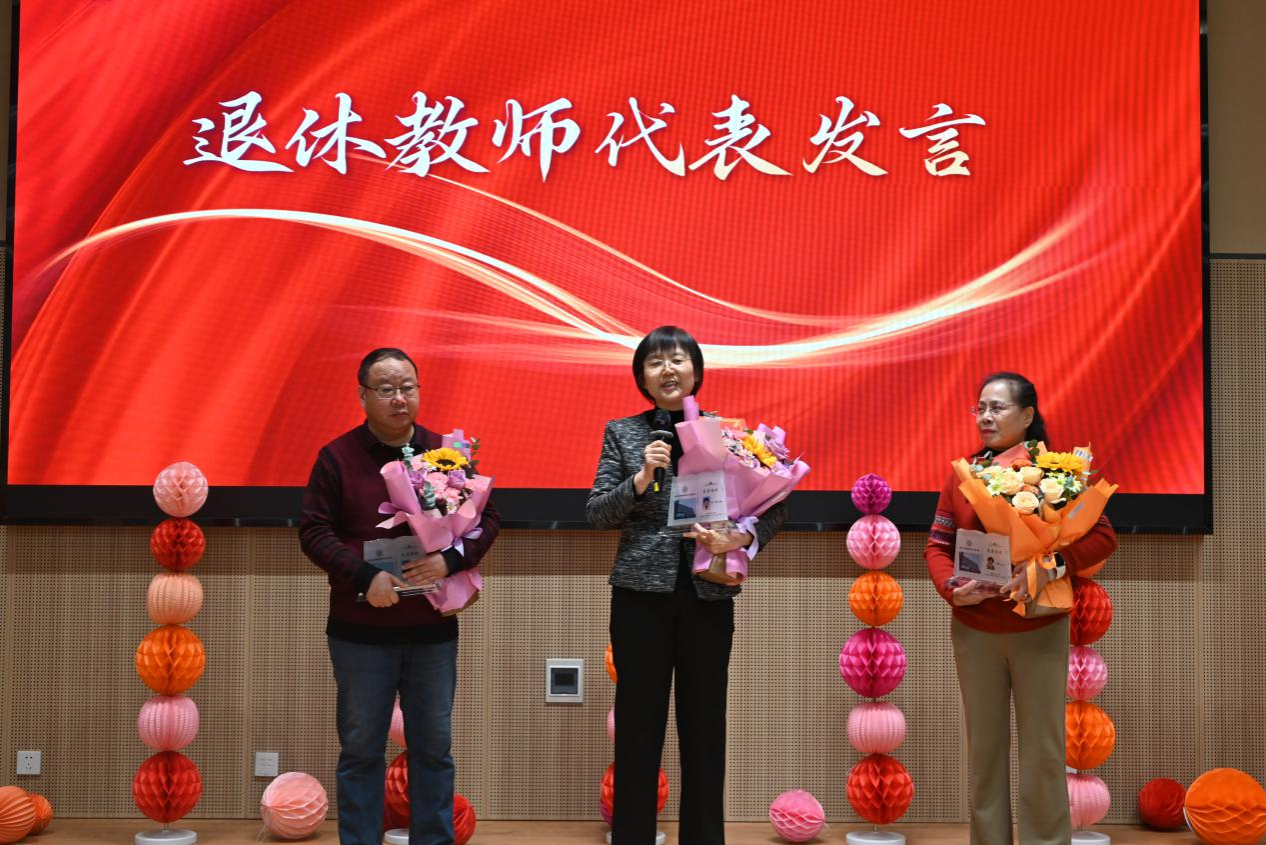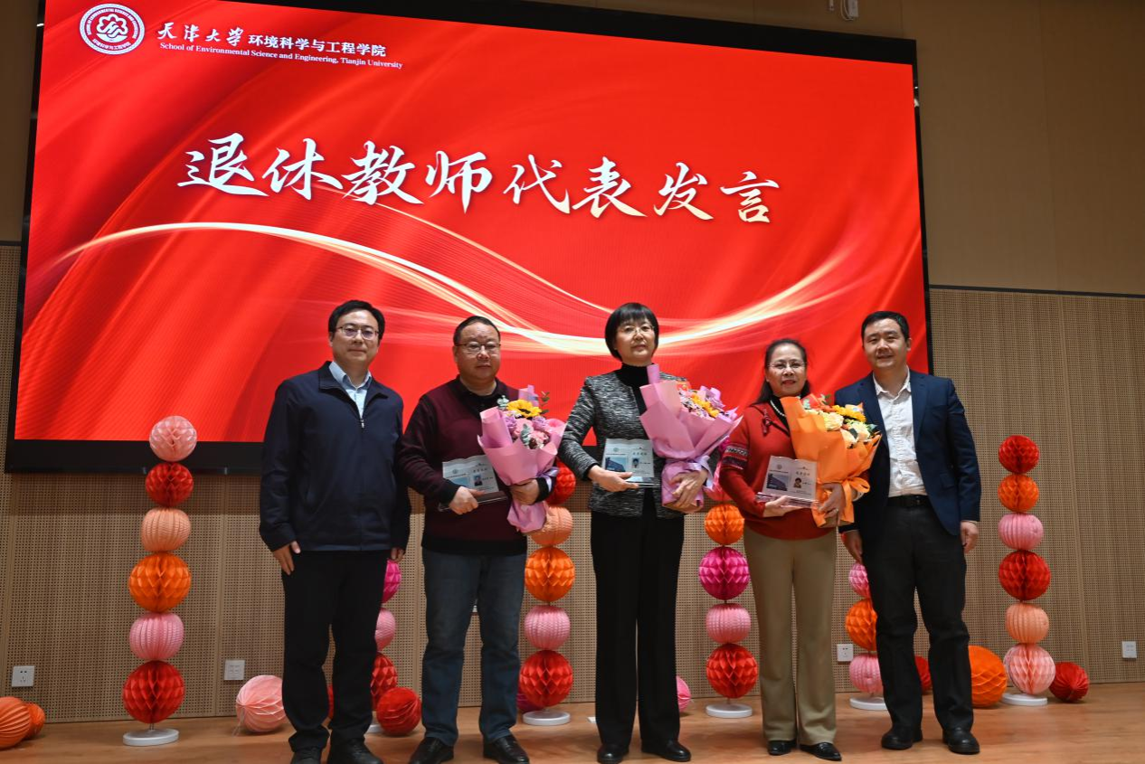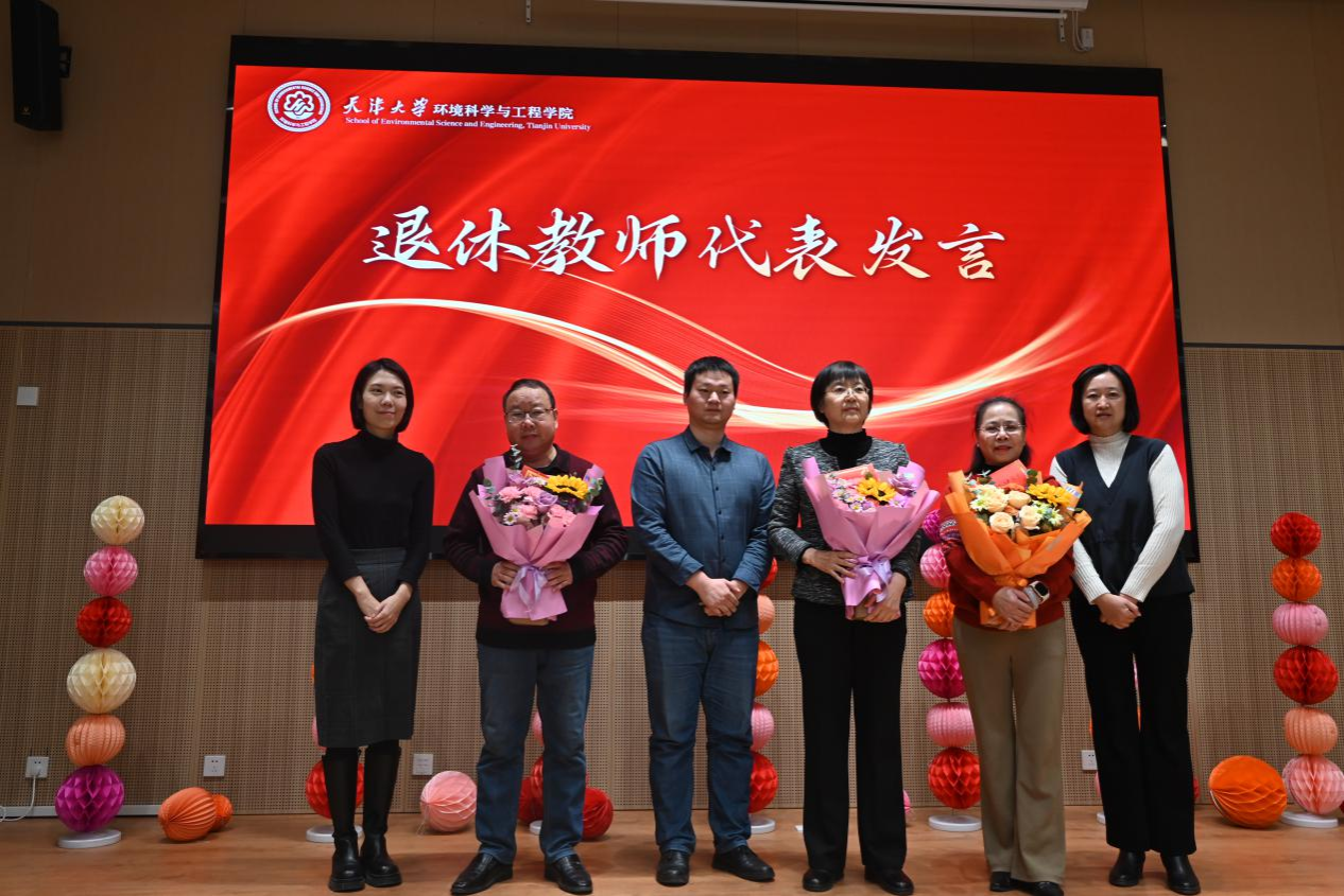 联欢会分为两个环节进行。上半场,学院院长展思辉首先作了环境学院事业发展情况报告,从学科建设、师资队伍、人才培养、科学研究、国际化等方面汇报了学院取得的丰硕成果,并对学院未来发展进行了展望。接下来,举行了环境学院2024年退休教职工荣休仪式,仪式以照片视频的方式开场,回忆了四位荣休老师多年工作的点点滴滴,青年教师为他们奉上了鲜花,学院杜云飞书记和展思辉院长为到场的退休老师颁发了荣休奖牌。