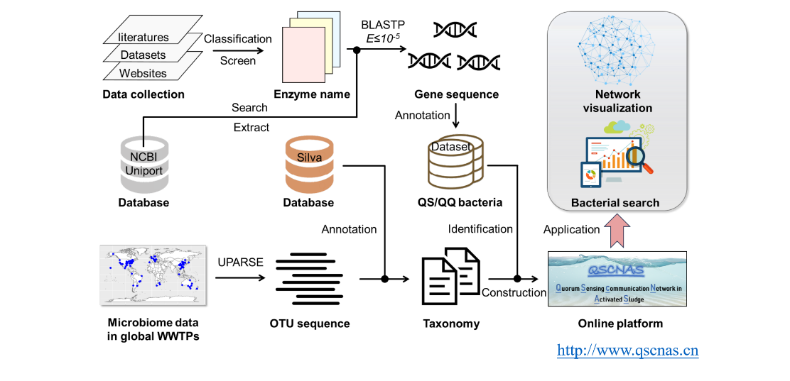 研究团队通过搜集全球269个污水处理厂的1000多个活性污泥样本,鉴定了活性污泥中潜在种群通讯细菌并搭建在线平台(https://www.qscnas.cn/)供研究者进行检索分析活性污泥中基于微生物通讯的相互作用。该平台的建设为理解细菌通讯的复杂性提供了一个全面的框架,同时向研究者提供了一个在线平台用于浏览,分类检索和种群通讯网络构建。该系列研究突破了对单一污水处理系统种群通讯研究的局限性,强调了环境生物处理系统中基于种群通讯调控增强性能和稳定性的应用潜力。