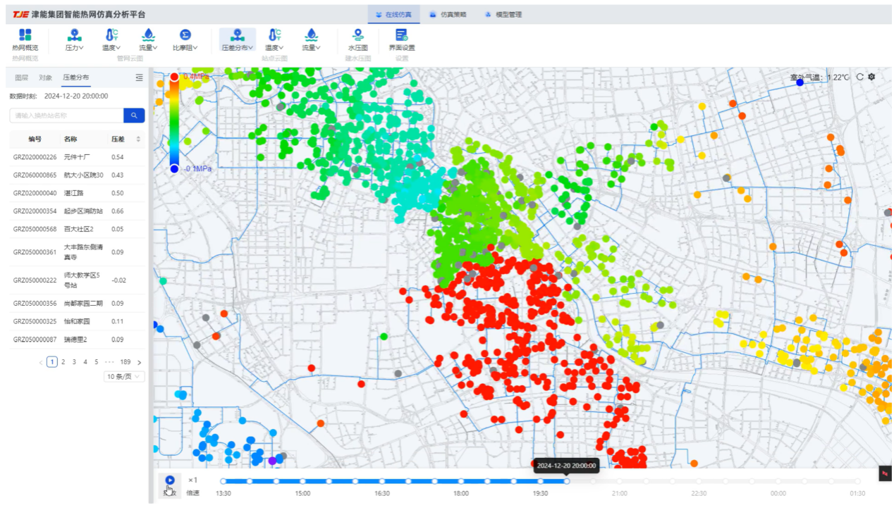 图6 天津市中心城区大热网1800余个换热站动态压差分布的在线仿真