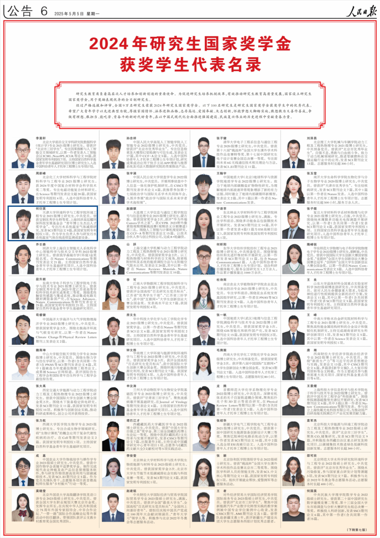 5月5日,《人民日报》专版刊登《2024年研究生国家奖学金获奖学生代表名录》,展示研究生国家奖学金获奖学生中的100名优秀代表的风采。我院2021级博士生何衍英入选名录。