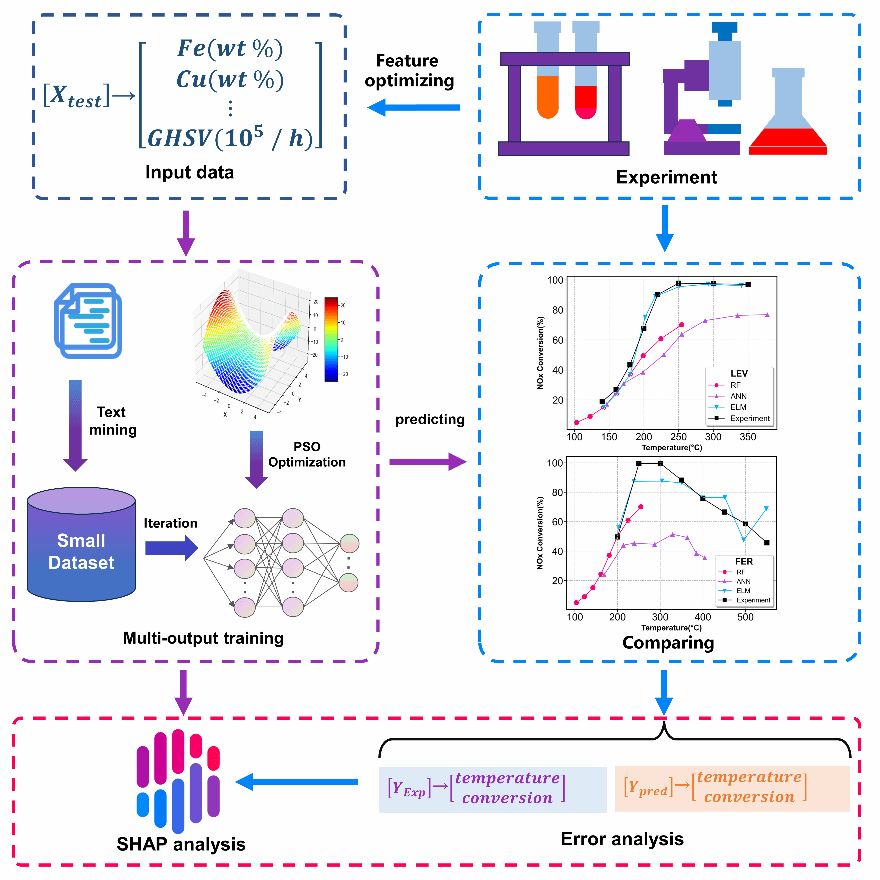 近年来,人工智能已成为推动科学研究和学科交叉创新的重要动力。天津大学高度重视AI与环境、材料等优势学科的深度融合,持续加大资源投入,积极搭建多学科交叉平台,推动人工智能技术在前沿科学领域的应用。本项研究正是学校大力推进“AI+”战略、促进学科交叉创新的典型成果,展现了天津大学在智能催化等领域的引领作用。氮氧化物(NOx)排放治理是柴油发动机清洁化的核心难题。高效选择性催化还原(SCR)系统的开发长期受限于实验数据稀缺与多参数复杂耦合,传统机器学习方法在实际工程应用中面临泛化能力弱、计算资源消耗大等瓶颈。针对上述挑战,本文提出了自适应极限学习机(AELM)多尺度框架,首次将自动化文献文本挖掘与多输出回归、特征融合、温度自适应偏置等机制深度集成,实现了在小样本、强非线性条件下对催化剂性能的高精度预测。