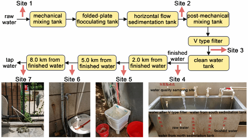 图1. 本研究的中国南方某净水厂工艺流程和七个采样点。