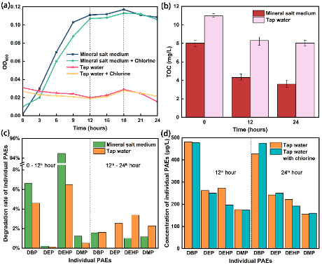 同时,在实验室搭建模拟管道装置,在第3个月时开始采集管道内壁生物膜样品。以4种常见的PAEs作为唯一碳源,分离得到了4株PAE降解菌,其在12小时内对初始总浓度为1 mg/L的PAEs的降解率为34.83%至56.54%。