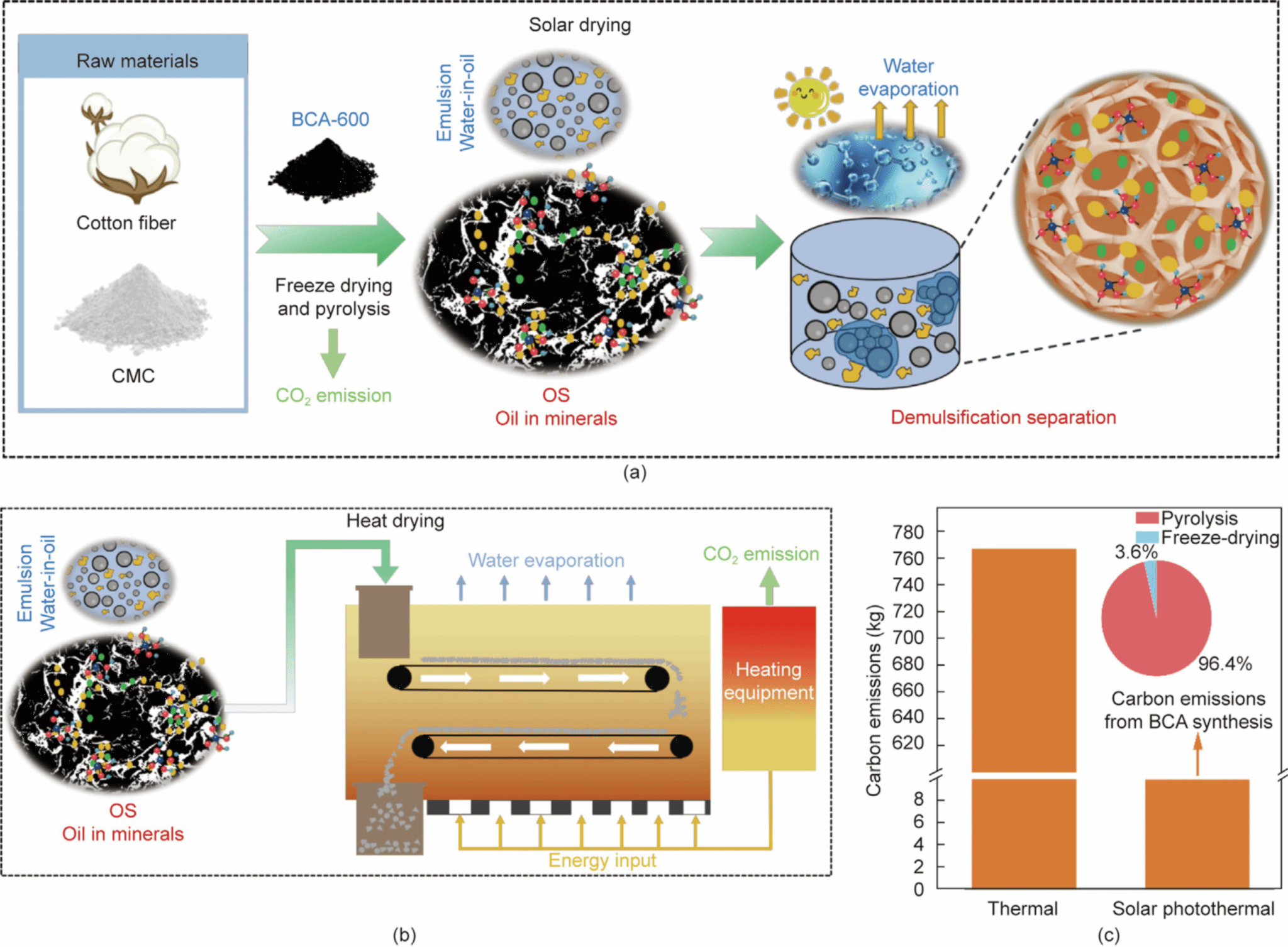本研究合成了一种具有多孔三维结构和光热转换特性的生物质碳气凝胶材料。有趣的是,该碳气凝胶具有可调节的表面润湿性,能够在水面吸附高粘度原油(吸附量达4.28 g·g⁻¹),并在太阳辐照辅助下实现水包油乳液的高效破乳分离(分离率达97.28%)。在太阳能加热与材料对乳液的分离-吸附协同作用下,油泥和乳液的光热脱水效果显著,在质量比为10:2(油泥:材料)条件下的最高脱水效率达到90.68%。此外,材料在脱水后的油泥中无需分离,可直接参与后续的热解过程,并通过限域催化裂解进一步增强处理效果,实现“一石二鸟”的协同效应。总体来看,该太阳能光热处理策略在处理含油污染物方面展现出巨大潜力,其碳排放相比传统热处理方法降低超过百倍,为石油行业的低碳转型提供了有力支撑。