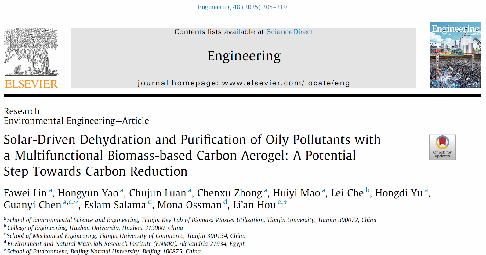 天津大学环境科学与工程学院生物质废物利用天津市重点实验室林法伟副教授团队在Engineering上发表研究论文《Solar-Driven Dehydration and Purification of Oily Pollutants with a Multifunctional Biomass-based Carbon Aerogel: A Potential Step Towards Carbon Reduction》,首次系统研究了太阳能光热驱动含油污泥、含油废水等石油污染的高效脱水与净化。
