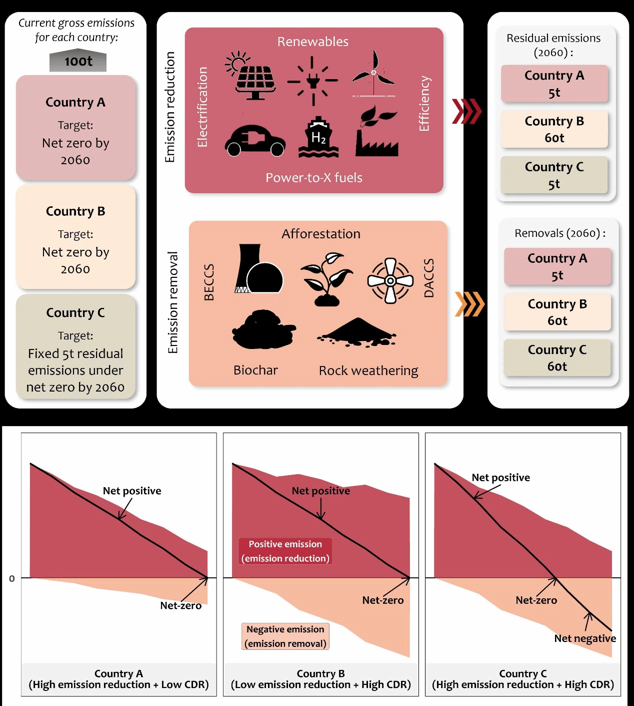 基于当前全球气候政策存在的以上问题,本研究提出了分别独立设定源头减碳目标和碳移除目标的策略。通过设定这两个降碳目标,用“两条腿”走路,两者合力来实现总体的净零目标。源头减碳与碳移除并非对立的关系,应该同时为两者设定各自的目标,这将不仅有助于加快减排进程的推进,还能促进碳移除技术的发展,成功破解了碳移除和全球减碳的困局。研究表明,与未明确区分源头减碳和碳移除目标的做法相比,单独设定目标在短期降碳、碳中和实现年份、负碳排放出现的时间点以及最大升温幅度等方面,都能带来更好的效果。
