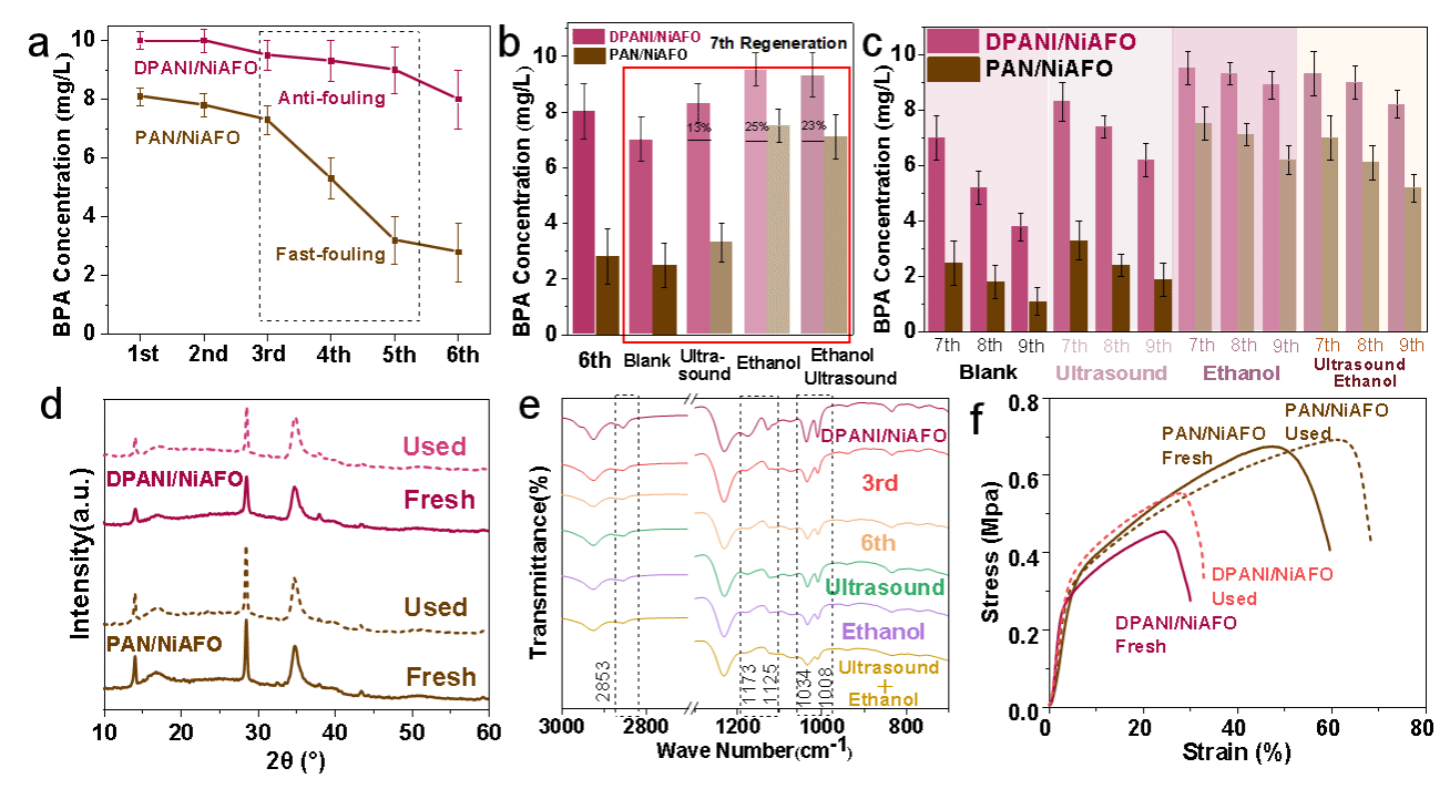 Fig. 2 Organic fouling test of PAN/NiAFO and DPANI/NiAFO and characterization of membrane performance before and after used. (a) The catalytic performance degradation trend of the catalytic membrane during six cycles of catalytic processes. (b) Catalytic performance changes in the 7th catalytic cycle using different regeneration strategies: Blank, ultrasound, ethanol, and ultrasound-ethanol regeneration. (c) Performance comparison of PAN/NiAFO and DPANI/NiAFO over three continuous catalytic cycles with different regeneration strategies. (d) Crystal structure stability of catalytic membranes after six catalytic cycles. (e) Surface functional group of DPANI/NiAFO after 3rd and 6th catalytic cycles and different regeneration methods. (f) Tensile performance analysis of catalytic membranes before and after use.