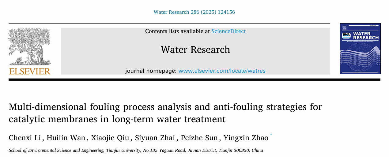 近日,天津大学赵迎新老师团队在Water Research上发表了题为“Multi-Dimensional Fouling Process Analysis and Anti-Fouling Strategies for Catalytic Membranes in Long-Term Water Treatment”的研究论文(DOI: 10.1016/j.watres.2025.124156),通过设计一种银基的催化膜材料,能有效抑制多种膜污染问题。研究人员在质子酸改性的聚苯胺(PANI)静电纺丝纤维中嵌入Ni掺杂的AgFeO2,显著增强了催化膜的抗污染性能。催化膜污染跟踪实验表明,PANI导电网络不但可以强化催化膜电子转移性能,还破坏了催化膜表面杂质离子的水解平衡,而银基催化材料也有效抑制了细菌的增殖,展现出多重抗污染效果。在含有双酚A(BPA)的天然河水净化实验中,该膜可以长效控制河水中BPA的浓度,并且可以去除超过58%的总有机碳(TOC)。研究重点分析了催化膜的抗污染机制,包括抗有机物污染、减少离子干扰和抗菌性能,还评估了催化膜的再生方法,为膜污染形成机制和膜再生提供了有价值的见解。