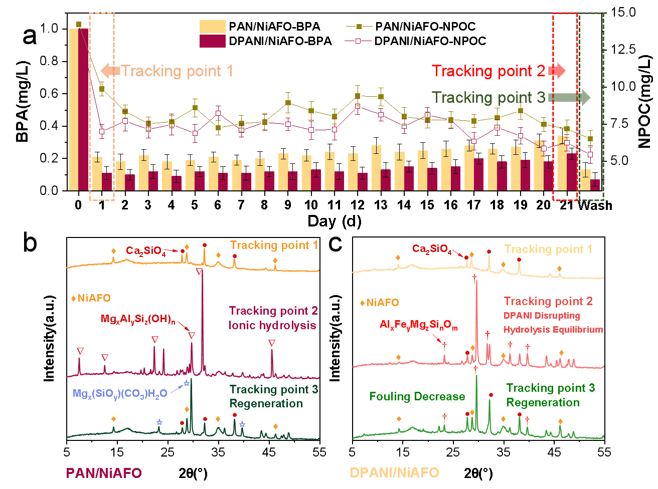 Fig. 5 (a) 21-Day Long-Term Fouling Tracking Experiment of PAN/NiAFO and DPANI/NiAFO: Continuous Monitoring of BPA and NPOC in Real River Water. Catalytic membrane structure and surface fouling analysis at three tracking points: 1-Day (Short-Term Fouling), 21-Day (Long-Term Fouling), and Post-Regeneration. (b) Surface pollution and crystal structure analysis of PAN/NiAFO at different tracking points: Fouling process dominated by ion hydrolysis. (c) Surface pollution and crystal structure analysis of DPANI/NiAFO at different tracking points: Disruption of hydrolysis balance by DPANI.
