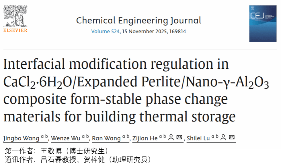 近日,我院吕石磊教授团队在建筑相变储热与材料科学交叉研究方向取得重要成果,相关成果以“Interfacial modification regulation in CaCl₂·6H₂O/Expanded Perlite/Nano-γ-Al₂O₃ composite form-stable phase change materials for building thermal storage”为题发表在化学工程领域一区期刊 Chemical Engineering Journal(CEJ)。该成果展示了吕石磊教授团队在跨学科协同创新方面的最新突破,对推动绿色建筑与新型储能材料融合发展具有重要意义。