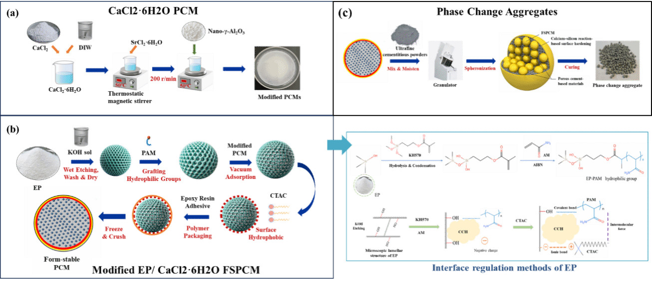 图1(a)CaCl₂·6H₂O相变材料改性与制备;(b)EP基定型相变材料改性与制备;(c)定型相变材料合成骨料应用于建筑结构储能领域