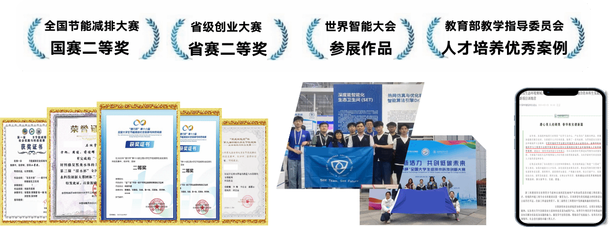 学生的创新思维和实践能力得到培养和提高。在项目式训练的基础上,学生积极参加全球高校挑战赛、挑战杯、全国大学生节能减排社会实践与科技竞赛等国内外科技竞赛,获奖11项。竞教融合教学模式被教育部教学指导委员会评为人才培养优秀案例。其中,学生在课程中卫生间空气质量监测项目基础上,进一步拓展设计的“智能监测生态卫生间”项目,作品经过选拔在世界智能大会、学校新工科成果展、天津大学海棠节等活动上进行展示,受到广泛关注与好评(图2)。