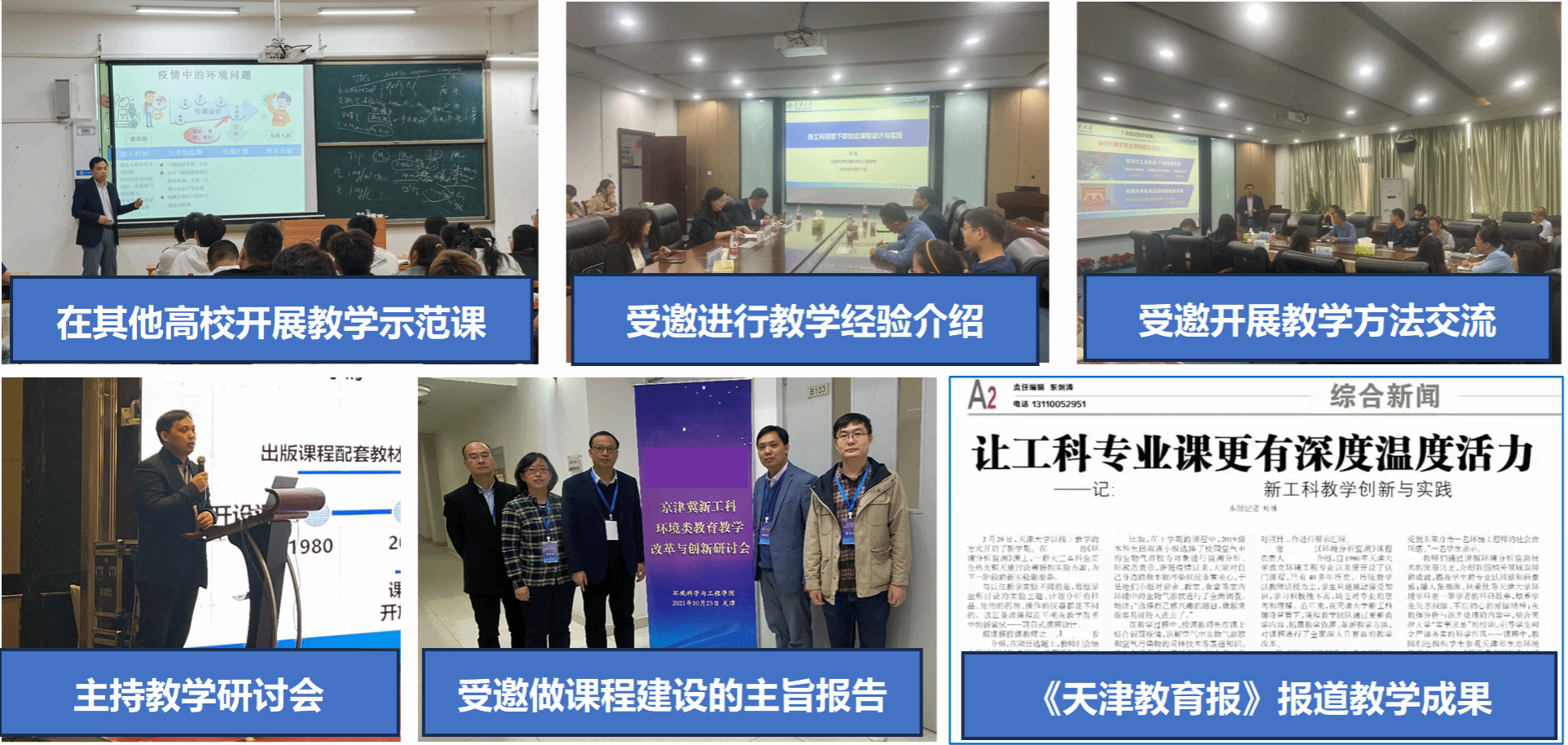教学团队承办教育部教指委主办的全国性教学会议,并通过会议报告推广教学改革方法。受邀到中国地质大学(武汉) 、南京理工大学、华北水利水电大学等高校进行课程建设经验交流。教学团队牵头组建环境监测课程群虚拟教研室,成员涵盖国内50余所高校和科研院所;举办了国内首次环境分析监测项目式课程设计成果展,受到全国40余所高校的100余位老师的参观和高度评价,在同类课程教学方面发挥了示范引领作用。《天津教育报》等媒体对课程的教学改革成果进行了报道(图3)。