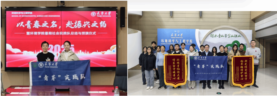 近日,在市委社工部指导、市生态环境局主办的 “天津市生态环境志愿服务大赛” 中,天津大学环境科学与工程学院两项项目荣登榜单,分别入选学校生态环境教育典型案例与生态环境志愿服务优秀案例。其中,“净水归源,水润民心” 项目依托京津冀生态文明教育实践创新联盟,联合 25 家单位构建生态文明教育新格局,服务覆盖近 30 万人;“红土育苗青,绿韵润童心” 项目聚焦生态教育与乡村振兴,探索高校育人新路径,取得良好社会效应。在前期丰硕成果的基础上,为进一步总结凝练实践经验、凝聚青年奋进力量,响应国家 “十五五” 规划中美丽中国建设与教育强国建设的战略部署,11月28日,天津大学环境学院暑期社会实践队总结与授旗仪式在59教A217隆重举行。环境学院党委书记杜云飞、党委副书记张灿、学工办主任王杨、实践队指导老师李维华、环境学院青年志愿者协会负责人、往届及现任实践队队员代表齐聚一堂,共同见证实践队正式定名 “青芽实践队”,开启服务乡村振兴与生态保护的全新征程。