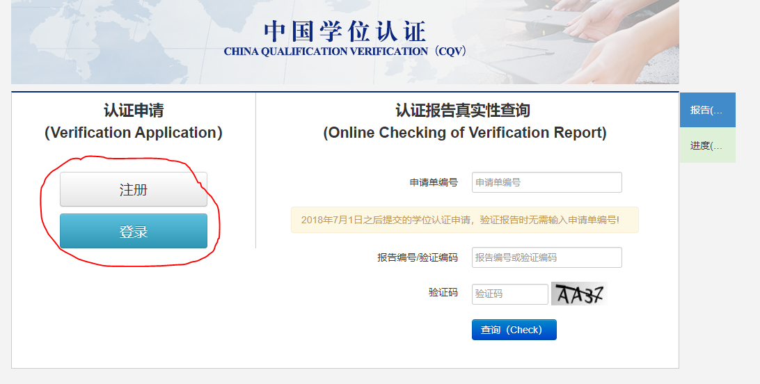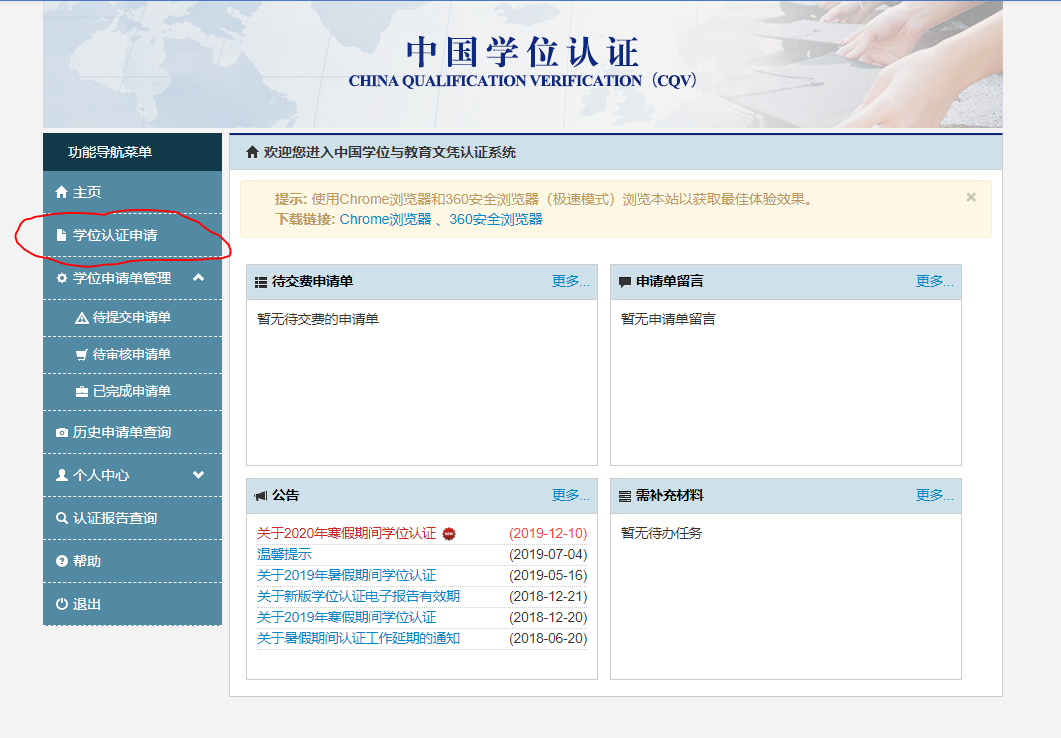 2.进入网页后,选择页面上方的“中国学位认证”。