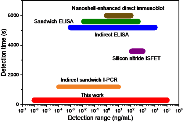 近日,天津大学王灿教授团队开发了一种新型的硅纳米线场效应管(SiNW-FET)生物传感器,用于快速、灵敏地检测MTB。选择MTB的典型标志物Ag85B蛋白质作为待测靶标,对生物传感器的表面功能化参数进行了探索和优化,获得最佳的操作条件。SiNW-FET生物传感器具有良好的灵敏度、重现性及稳定性,对MTB Ag85B蛋白的检测限为0.01 fg/mL,并且在1 fg/mL-100µg/mL范围内电流信号与蛋白质浓度的增加呈线性关系,可初步用于定量检测,整个测试周期最快只需30秒即可完成。