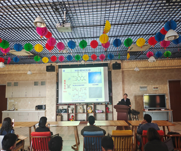 张登松副院长进行了题为“固定源烟气氮氧化物催化净化”的报告。张院长首先提出了氮氧化物控制的紧迫性这一问题。从生产源、控制技术和关键科学问题几个方面进行了介绍。张院长的介绍让大家意识到传统技术存在很多不足,尤其是在催化剂失活方面。因此,张院长提出了以保护位抑制催化剂中毒失活这一创新思路。目前主要的研究方向分为:利用L酸保护位抑制二氧化硫中毒;利用L碱保护位抑制碱金属中毒;以及利用保护位结合酸碱拮抗效应抑制复合中毒。随后,张院针对每种方向,分别介绍了目前的进展情况,并分别举以实例:如用TiO2保护位减少硫酸盐沉积-抑制活性物种硫化;硫酸根保护位抑制碱金属中毒;二氧化硫与金属离子的酸碱拮抗效应等。最后,张院做出了总结,再次提出L酸碱理论设计活性保护位抑制NOx净化催化剂中毒失活的新理念。明确了保护位维持NH3与NOx快速吸附和反应的抑制中毒作用机制。开发了形成保护位抑制复合中毒的NOx催化净化新技术。在听完张院的报告后,每名在场的师生都觉得受益良多。
