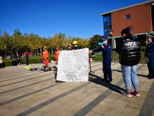 13:20分,各楼层疏导员提前到达疏散位置;13:30分,演习正式开始,各楼层疏导员播放火灾警报。听到警报声,师生们按照演习方案要求,在各层疏导员的认真指挥下,按照指定通道安全有序地从办公室和实验室迅速撤离,安全到达北广场指定集结地点,没有出现拥挤、踩踏等现象。各楼层疏导员随即对每个房间进行检查,确认没有人员滞留后,最后撤离43楼。安全员疏散到安全地带后,清点人数上报给负责人。至此,火灾疏散环节顺利完成,全程用时3分20秒,达到了快速、高效、有序的演习目的。