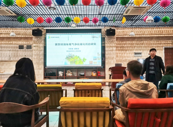 环境学院刘彩霞副教授进行了题为“重型柴油车尾气净化催化剂的研究”的报告。氮氧化物及PM2.5对环境生态、景观及人体健康均有极大危害,汽车尾气是排放该类污染物的一大不可忽视的移动源。基于此开发的银掺杂钙钛矿催化剂可利用NO辅助烟尘循环氧化还原。此外,高/低硅铝比分子筛催化剂具有不同的优缺点,通过对晶化机理、水热机理等的探究,可分别提高两类催化剂的成本与性能。以煤矸石合成SSZ-13分子筛、新型Cu-ZK-5分子筛、OFF-CHA分子筛、OFF-ERI分子筛为例的分子筛都是对新型分子筛的成功探索。在报告之后,刘彩霞副教授与老师、同学们进行了关于该类分子筛存在的不足及实际应用可能的讨论,加深了大家对小型催化剂的认识。