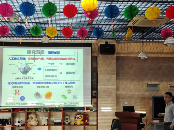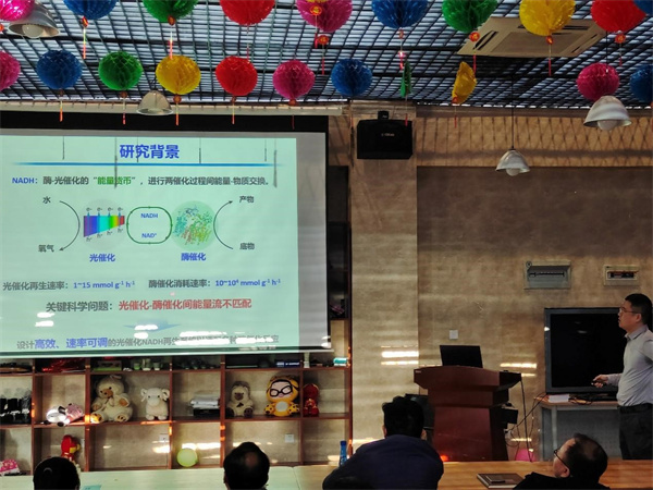 石家福老师进行了题为“光合作用与人工光合成”的报告。石老师首先对课题的研究背景进行了介绍:随着能源危机、气候变化等的不断出现,可再生能源的进一步发展将被持续驱动。接着石老师就介绍了相关领域的国际前沿技术——人工光合系统。它能模拟光合作用,利用太阳能驱动物质合成。紧接着,捕光材料收集并供给能量,借助助催化剂进行各种催化反应来处理环境问题。助催化剂的种类和功能决定反应物系,即:光-化学、光-微生物、光-酶三种人工光合系统。而石老师的主攻方向即为光-酶这一光催化系统。这种技术的关键科学问题是:光催化-酶催化间能量流不匹配。而解决方法就是设计高效、速率可调的光催化NADH再生系统以适配多种酶催化反应。石老师在介绍研究思路的时候提出了道法自然的理念——学习自然界类囊体中光吸收、电子传递与利用、分子传递、光保护等过程,以实现辅酶的高效光催化再生。紧接石老师介绍了PSII启发下的辅酶再生系统以及类囊体膜启发的辅酶再生系统等。最后,石老师提出了辅酶/酶-光催化剂作用过程及机制。让大家从机理层面,更深刻的认识并了解了相关技术。