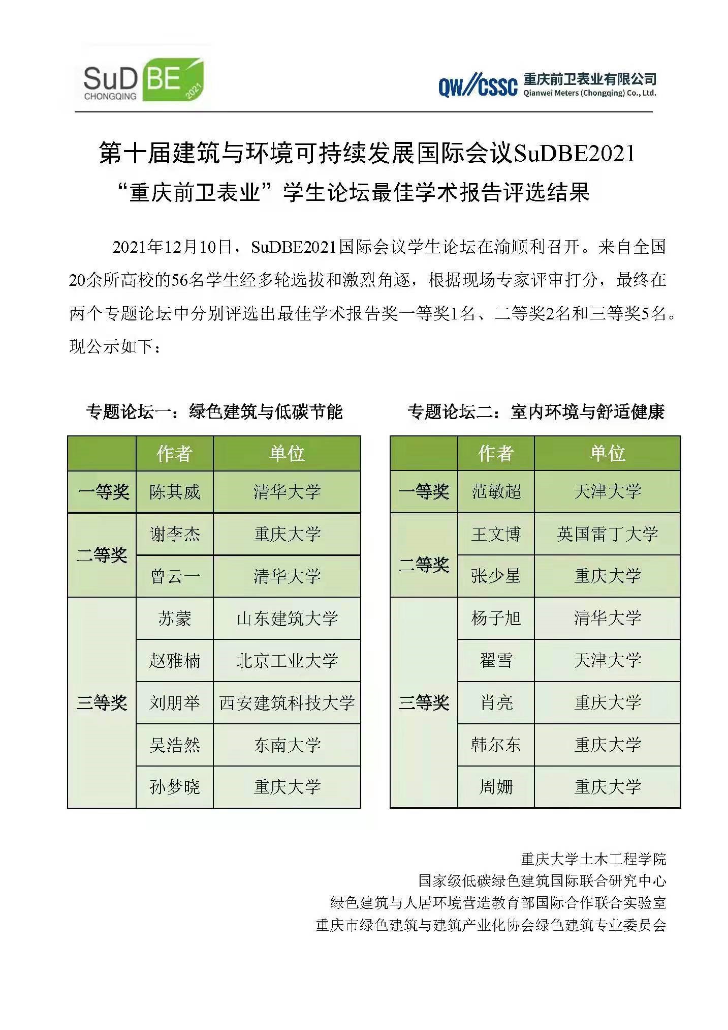 2021年12月10日-12日,由重庆大学、英国剑桥大学和雷丁大学联合主办的“第十届建筑与换可持续发展国际会议SuDBE2021”暨“第十一届夏热冬冷地区绿色建筑联盟大会”在重庆召开,会议通过线下、线上同时进行。我院吕石磊教授指导的两名博士生在此次会议的全英文学生论坛中获得最佳学术报告奖,其中2020级博士生范敏超做的主题汇报“Multi-layered and Multi-Dimensional Suitability Evaluation Framework for Green Building Energy-saving Technologies” 因研究内容创新性强,口头表达专业流利获最佳学术报告奖一等奖;2018级直博生翟雪做的主题汇报“Optimization study of solar-ground source heat pump systems for primary and secondary schools in northern villages and towns”获得最佳学术报告奖三等奖。