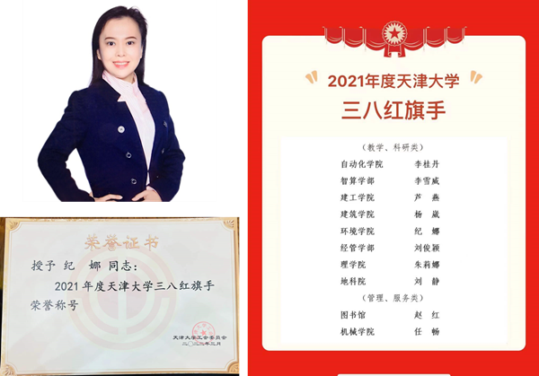 为表彰先进、弘扬典型,充分发挥三八红旗手(集体)荣誉的先进示范引领作用,在第112个“三八”国际妇女节来临之际,天津大学开展了2021年度校级三八红旗手(集体)评选工作,遴选出一批立足岗位、担当尽责、甘于奉献、勇于进取的优秀女教职工代表。经过层层选拔,我院纪娜老师荣获 “天津大学三八红旗手”荣誉称号,其事迹也被收录在天津大学优秀女教职工风采展活动的“巾帼英姿录”中,以此展现我校优秀女教职工群体爱岗敬业、乐于奉献的精神风貌,激励全校女教职工立足本岗,奉献巾帼智慧和力量,为谱写未来新篇章,创造天大新辉煌做出新的更大贡献。