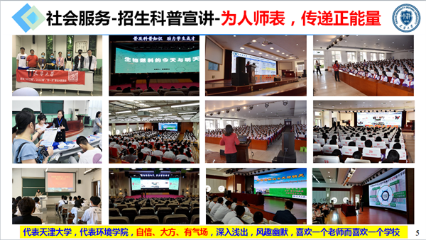 纪娜老师积极参加学校本科生及研究生招生宣传工作,担任天津市津南区咸水沽一中招生宣传组组长,连续几年参加高考咨询活动;同时积极参加学院负责的黑龙江省本科生招生宣讲工作,为黑龙江多所高中举办讲座报告共计6场;作为天津大学研究生招生代表团成员连续几年赴全国各高校参加研究生招生宣讲20余次,为天津大学的招生宣传工作做出重要贡献。