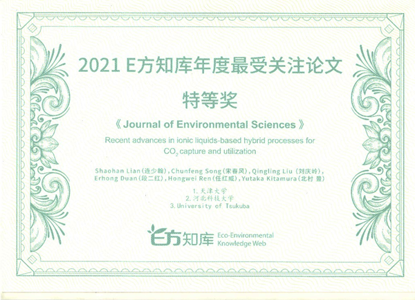 近期,由中国科学院生态环境研究中心开展的“E方知库2021年度最受关注论文评选活动”结束,我院大气团队在国内高水平期刊《Journal of Environmental Sciences》上发表的文章“Recent advances in ionic liquids-based hybrid processes for CO2 capture and utilization, ”,获得E方知库年度论文特等奖,该论文也同时入选ESI高被引论文。文章第一作者为博士生连少翰,通讯作者为宋春风教授。