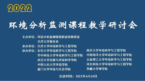 4月10日,由环境分析监测课程群虚拟教研室和天津大学教务处联合主办,天津大学环境科学与工程学院承办,东华大学、华中科技大学、武汉大学、中国人民大学、厦门大学、南开大学、中国海洋大学、太原理工大学、河北科技大学、西藏大学等单位协办的“2022环境分析监测课程教学研讨会”,以网络会议的形式成功举行。本次研讨会以“新工科背景下环境分析监测课程建设”为主题,围绕教学内容、教学方法、教学评价、课程思政等方面进行交流和讨论。