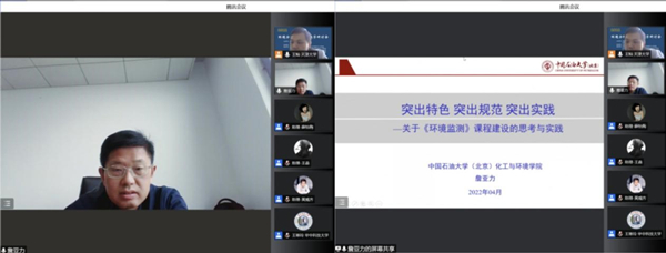 中国石油大学(北京)詹亚力教授以“突出特色、突出规范、突出实践-关于环境监测课程建设的思考与实践”为主题作了相关报告,阐述了关于课程建设信息化的几点认识,并介绍了从疫情开始的完全反转教学到现在基于信息辅助手段的混合教学方式的探索,最后提出了强化石油特色、强化标准规范、强化预习引导自学的教学方式。