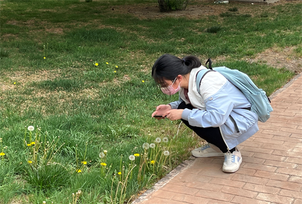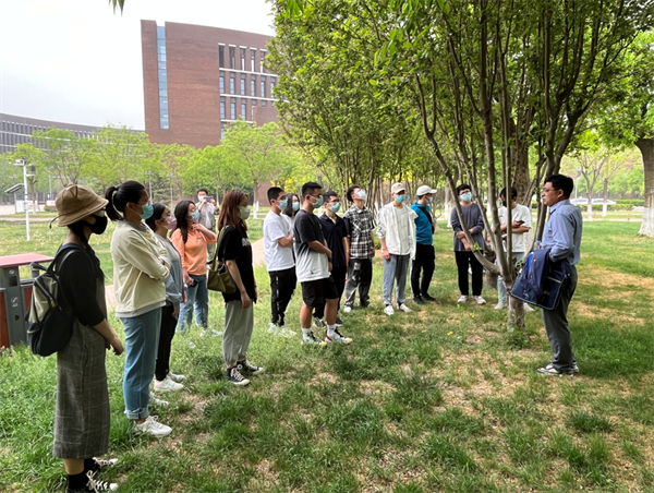 首先,黄俊和赵迎新老师向同学们进行了风趣的自我介绍,在师生们在欢声笑语中开启了本次游学活动。黄老师站在摇曳的树影下,将海棠、法桐、皂荚、山桃的鉴别和养护方式娓娓道来,同学们一边聆听着老师的讲述,一边近距离观赏校园里多种多样的植物。师生们边走边聊,穿过浓密的法桐树荫,捡起皂荚树的果实,抚摸山桃油亮发红的枝干……植物学的知识如此生动地出现在眼前,同学们都兴致盎然,围着老师争前恐后地提问,老师们也一一耐心解答。经过求实广场时,黄老师看到一个压着草坪的广告牌,带领大家一起把广告牌挪到了铺装上,并笑着说:“小草会感谢大家的”。