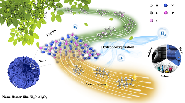 近日,天津大学环境学院纪娜教授团队在国际知名期刊ACS Catalysis(IF=13.084)发表封面文章《Highly selective hydrodeoxygenation of lignin to Naphthenes over three-dimensional flower-like Ni2P derived from hydrotalcite》,在木质素加氢脱氧制取环烷烃领域取得重要进展(https://pubs.acs.org/toc/accacs/12/2?ref=pdf)。研究人员提出了一种低温合成具有花状多孔结构的水滑石基磷化镍催化剂(Ni2P-Al2O3)的策略,在500 ℃下用红磷进行原位磷化,使得Ni2P催化剂具有小的粒径、丰富的活性和酸性位点,有利于底物和H2的活化。在Ni2P-Al2O3催化剂对木质素衍生的各种醚类和酚类化合物的加氢脱氧中,在250℃下获得了100%的转化率和高于85%的环己烷收率。此外,Ni2P-Al2O3在更复杂的木质结构(包括木质素油和木质素)的解聚中表现出较好的加氢脱氧活性。在Ni2P中两种不同类型的Ni位点(Ni(1)和Ni(2)),DFT计算表明,与Ni(1)位点相比,Ni(2)位点高度暴露在Ni2P-Al2O3表面,在愈创木酚的加氢脱氧过程中具有更强的打破C-O键的能力。该工作为催化剂的理性设计和木质素加氢脱氧机理阐述方面提供了新的思路。