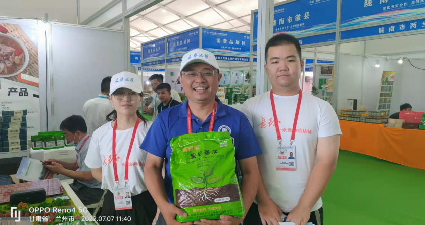 甘肃省宕昌县为天津大学定点帮扶对象,甘肃本然农业生物科技有限公司是环境学院在宕昌县重点科技帮扶企业之一。本然公司依托环境学院丁辉、黄俊课题组的科技帮扶,秉承“环保、绿色”理念,致力于农业废弃物的资源化利用。以菌菇渣、植物秸杆、畜禽粪便等农业废弃物为原料,采用发酵堆沤等工艺生产生物有机肥、栽培基质、育苗基质等,达到变废为宝、保护生态环境、助力乡村振兴建设的目的。其中,具有国际领先水平的“边修复、边增产”技术拥有8项专利成果,具有不误农时、不改变耕种习惯、低成本修复农耕土壤等显著特点。本然公司计划3年内达到生产有机肥系列产品8万吨/年,极大缓解宕昌县有机肥资源的短缺。此次展出的系列产品在兰洽会上吸引了众多用户,纷纷到会展中心展馆进行咨询、签单,为其畅销省内外奠定了良好基础。