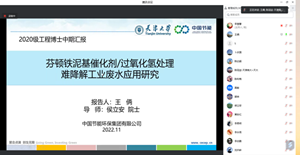 2022年11月25日,天津大学环境科学与工程学院在线举办了2020级博士论文中期报告会-工程博士专场,本次汇报涉及2020级全体工程博士,包括全日制、非全日制、项目制工程博士生,共计27人,侯立安院士、刘文清院士、段宁院士、雷霆宙教授、陈冠益教授等35位工程博士导师受邀作为校内评委参加。同时,汇报会还邀请清华大学环境学院刘锐平教授、中国矿业大学黄丛亮教授、中环保水务投资有限公司副总经理徐伟、中环保水务投资有限公司研发中心副主任袁芳、中节能建筑节能公司原副总经理陈玮及中国节能环保集团科技部副主任谢正武等校外专家参加。