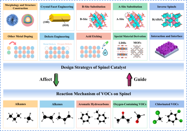 VOCs作为一大类典型的气态污染物,能够通过催化氧化法进行有效控制,该方法的核心问题是设计稳定高效的低温催化剂。近年来,由于过渡金属氧化物具有成本低、热稳定性好、耐毒性好等优点,许多研究都集中在提高其催化性能以取代贵金属催化剂上。尖晶石氧化物(AB2O4)作为一类用于VOCs高效去除的非贵金属催化剂,以其具备价格低廉、来源广泛、结构可调、化学成分多样和令人满意的稳定性等优点,受到了广泛的关注。而如何选择合适的方法构建和修饰尖晶石氧化物,以去除不同种类的VOCs仍需要进一步澄清。