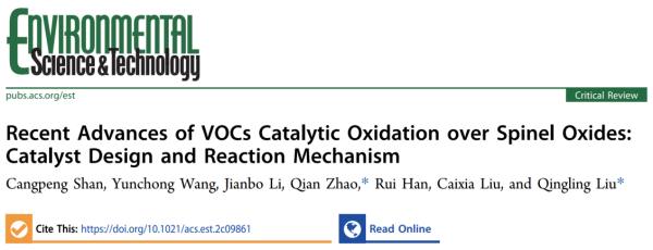 近日,大气环境与生物能源团队刘庆岭教授在国际高水平期刊《Environmental Science & Technology》在线发表了题为《Recent Advances of VOCs Catalytic Oxidation over Spinel Oxides: Catalyst Design and Reaction Mechanism》(DOI: 10.1021/acs.est.2c09861)的综述,该文章被选为内封面。环境学院博士生单苍鹏为论文第一作者,天津大学环境学院为第一署名单位。