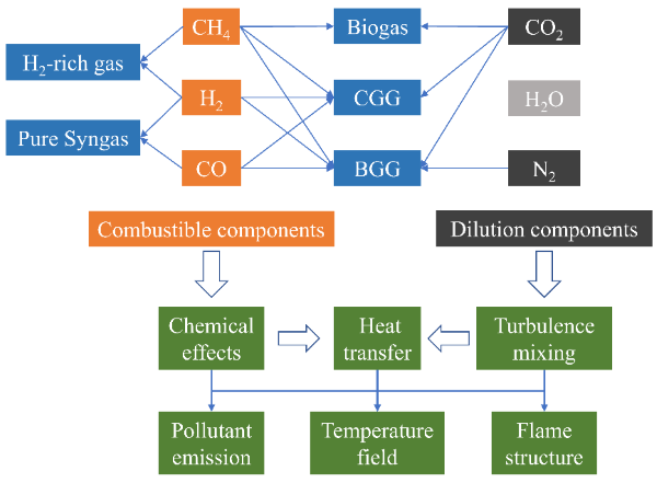 该文章的主要内容:生物质/有机固废/低阶煤等通过气化、热解、发酵以及工业冶炼等过程产生的低热值气体(LCVG)在分布式能源供应中发挥重要作用,低热值气体的利用对于双碳目标实现也具有重要意义。不同种类的低热值燃气具有显著的组分差异(图2),常规方式难以实现清洁稳定燃烧,组分波动下对燃烧组织方式和燃烧设备设计与运行带来更大的挑战。MILD燃烧(Moderate or Intense Low-oxygen Dilution combustion)是中度或重度稀释下的一种低氧燃烧技术,兼具燃烧效率高、污染物排放低的优点,陈冠益教授团队前期研究揭示了该技术的低氧和分布燃烧模式天然契合低热值气燃气特性,NOx和CO等污染物可以达到超低排放水平,因此将MILD燃烧技术应用于低热值燃气具有良好的应用前景。但低热值燃气种类繁多、组分复杂且波动,当前的研究普遍局限于单一组分的低热值燃气;另外MILD燃烧的定义和界定方式尚未完全统一,建立方法和燃烧器构造也并不相同。这造成了当前低热值燃气MILD燃烧的研究偏向破碎化,不同学者之间的研究难以比较,阻碍了这一领域理论和技术的迅速发展。基于此,该文章基于当前已有研究,从低热值燃气的基础可燃组分(CH4、H2、CO)出发,逐一分析可燃组分和稀释组分的影响,并分析其化学效应、湍流与混合效应,耦合热传导,明晰组分对污染物、温度场、火焰结构的影响(图3);最终揭示了富氢燃气、合成气、沼气、煤气化气、生物质气化气等低热值气体的MILD燃烧特性和组分影响机制。