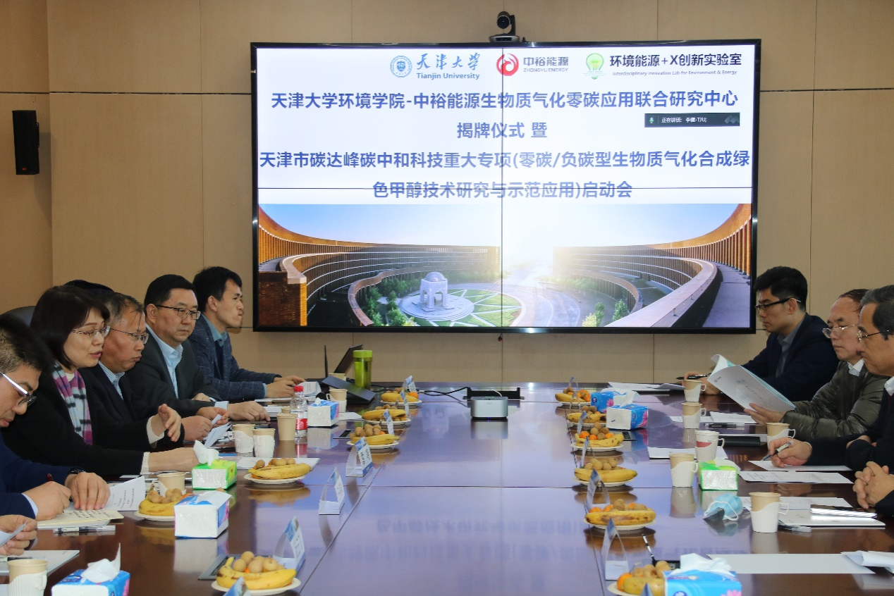 在实现碳达峰、碳中和的国家战略背景下,为进一步促进产学研融合发展与深度协同创新,2024年12月29日下午,在天津大学环境科学与工程学院A218会议室举办“天津大学环境学院-中裕能源生物质气化零碳应用联合研究中心揭牌仪式暨天津市碳达峰碳中和科技重大专项(零碳/负碳型生物质气化合成绿色甲醇技术研究与示范应用)项目启动会”。