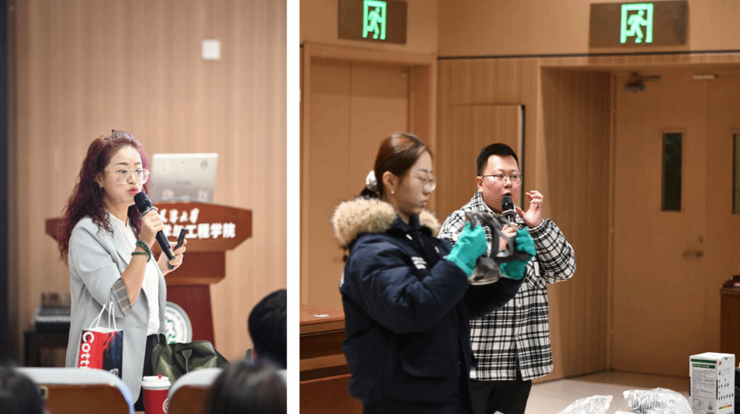 在交流互动环节,资产处把讲台变为“防护装备展示台”,现场依次展示防护手套、防腐蚀服、过滤式呼吸面罩、护目镜等十余种常用装备,并逐一示范正确佩戴与检查要点,为同学们带来一堂沉浸式的“安全穿戴必修课”。