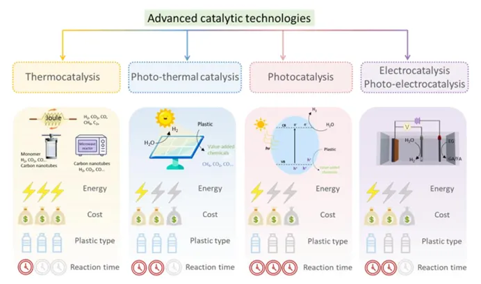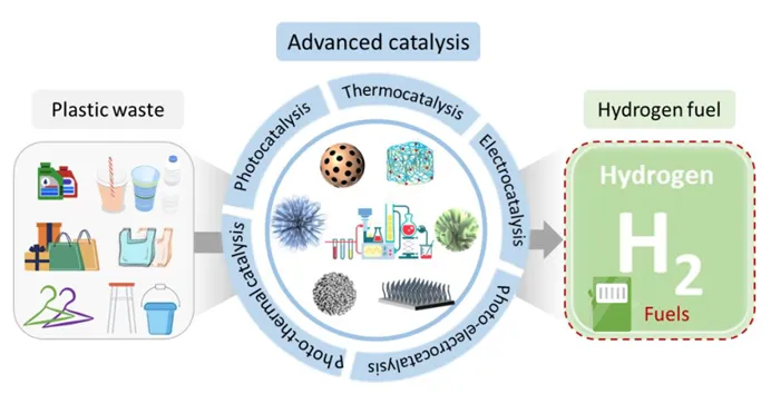 在此背景下,催化转化正成为塑料化学回收与高值化利用的核心技术路径。通过合理设计催化剂,可在较低能耗条件下将废塑料高效转化为目标产物。尤其是利用先进催化体系选择性制备氢气(H2),不仅可从塑料中回收高能量密度的清洁燃料,还可缓解对化石资源的依赖。然而,当前工业氢气主要来源于煤气化和甲烷蒸汽重整,碳排放强度高,促使开发温和、节能的替代制氢路径愈加重要。塑料催化制氢兼具能源回收与环境治理双重价值,近年来多种热催化、光催化、电催化与光电催化技术不断涌现,但缺乏针对其制氢性能及经济与环境可行性的系统性评述,因此亟需开展全面总结与深入分析。