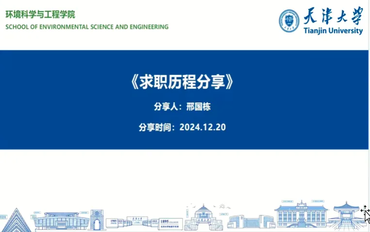 天津大学环境学院秉承立德树人、为党育才、为国育人的初心与使命,培养了一批批杰出的人才。为鼓舞学院学生积极拥抱、奋进新时代,在实现中华民族伟大复兴中国梦的新长征路上奋勇搏击,特开展青年校友就业经验分享系列活动。学院邀请环境学院的青年校友带来精彩的讲座,校友将结合自身情况、就业经验以及工作经历,分享个人感悟和心得,同时帮助学生们更清晰的做好规划。同学们也可以以校友为榜样,做好未来就业规划。