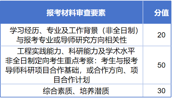 (2)院级初审:学院按照该专业学位领域,成立申请材料初审小组,对申请材料进行审核,材料审核结果满分为100分,学院将根据审核结果,结合当年招生计划,拟定初审合格分数线。按照一定的比例择优选拔进入综合面试的考生,材料审核的主要依据为:
